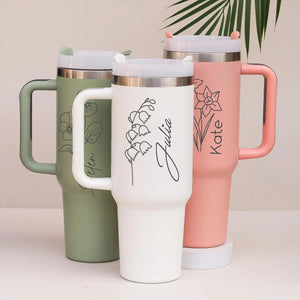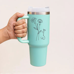 Customized 40oz Tumbler with Handle & Straw, Personalized with Name and Birth Flower
